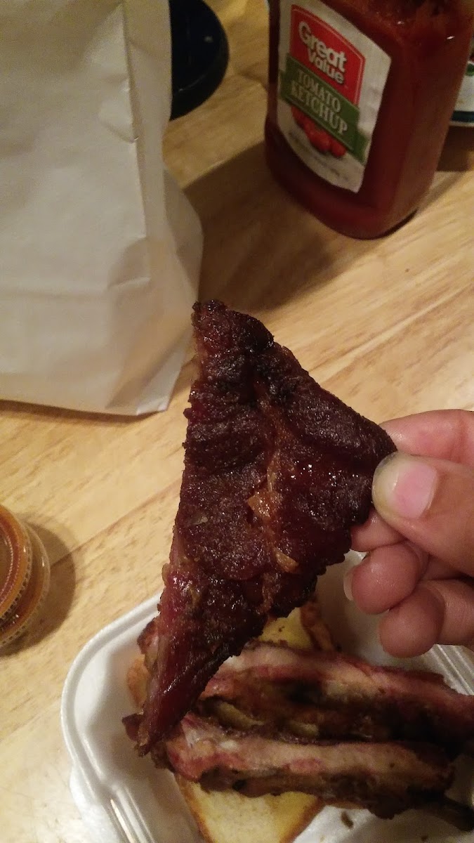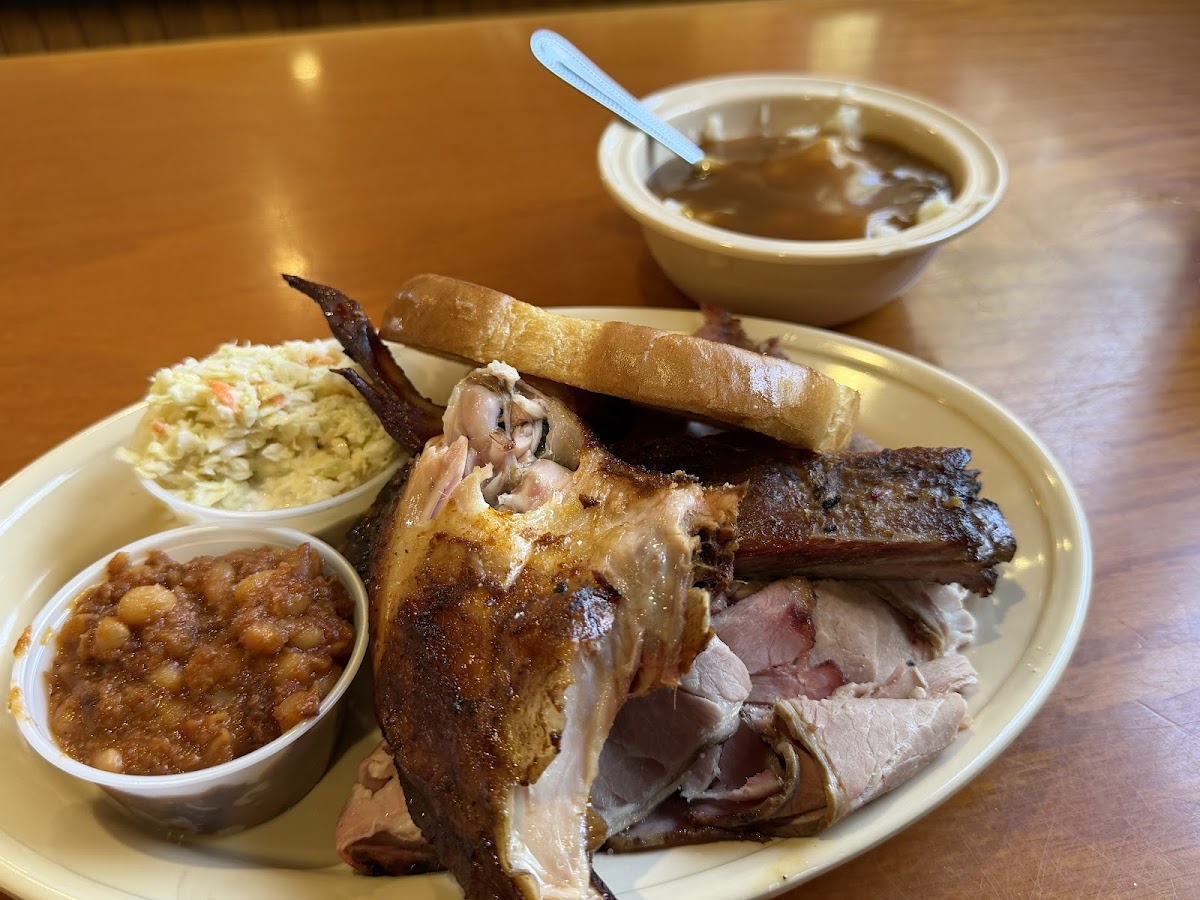 Inside, the menu is printed big and bold on the wall, with classics like ribs, pulled pork, smoked chicken, and sliced brisket. I ordered what the cashier called house favorite, a combo plate with ribs and pork, and she added, you can’t leave without trying the sweet tea. She wasn’t exaggerating. The tea comes in a mason jar-style cup, and it’s so cold the glass sweats like it just ran a marathon.